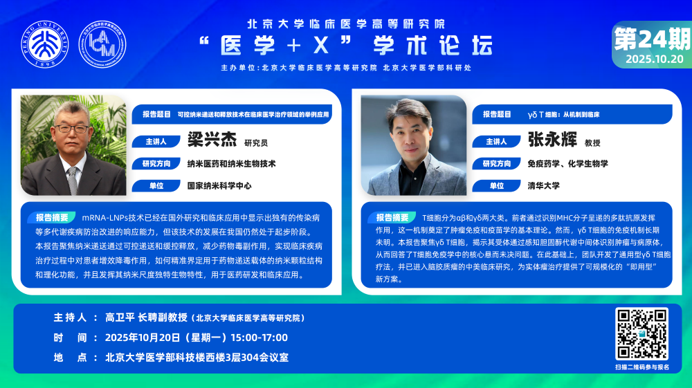 2023年12月北京大学临床高等研究院启动建设,为了践行协同创新促进学科交叉融合,临床医学高等研究院与医学部科研处合作,推出北京大学临床医学高等研究院“医学+X”系列学术论坛,为突破医药领域关键问题、培养高水平医学科技创新人才赋能。欢迎广大师生参会!