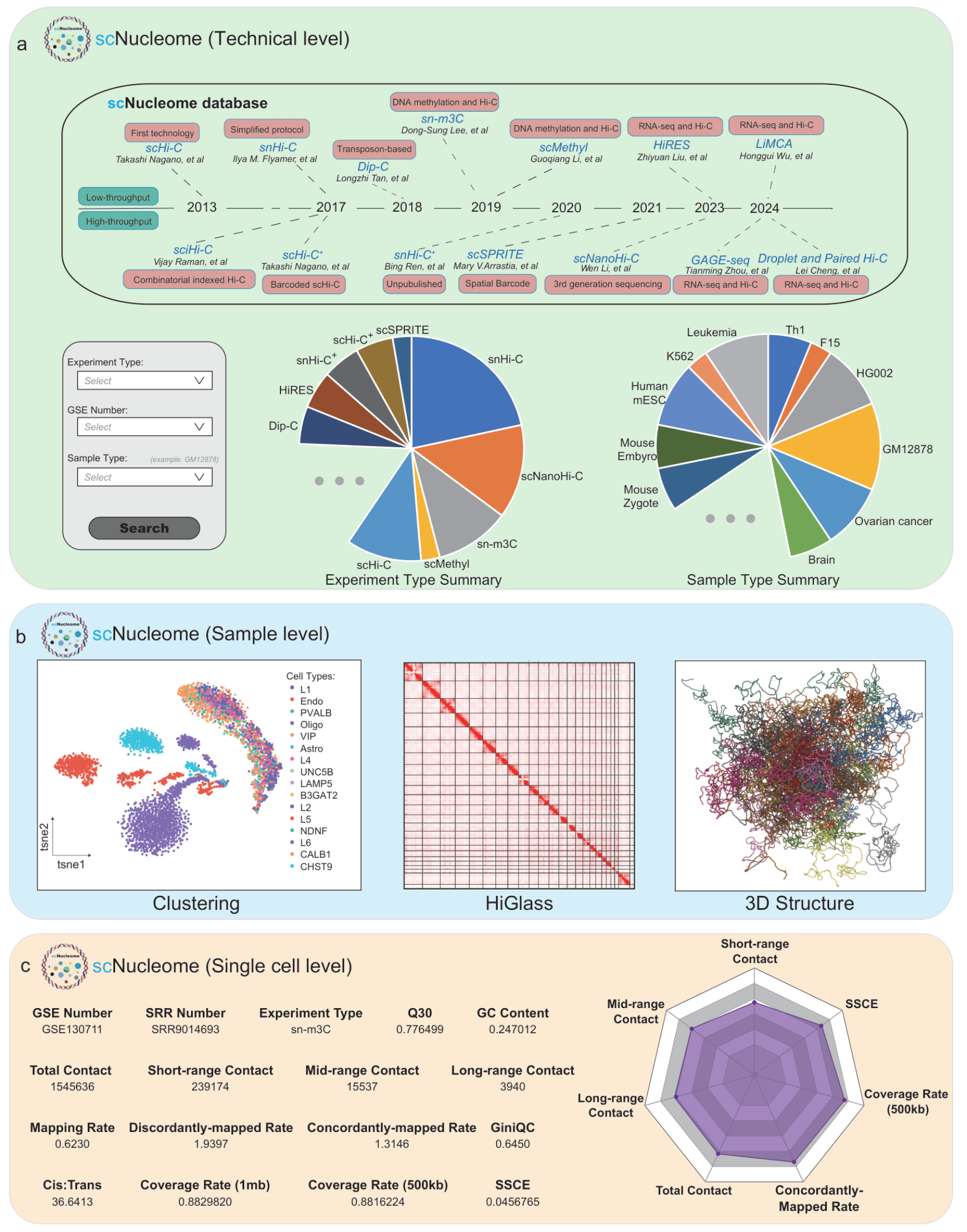 进一步地,作者构建了统一处理的单细胞三维基因组资源库 scNucleome。该数据库整合了多物种、多组织来源的 sc3DG-seq 数据,所有数据均通过 STARK 框架进行标准化分析,从而实现了跨技术、跨实验条件的直接比较。scNucleome 为单细胞三维基因组结构的系统研究、方法开发以及机器学习和大模型训练提供了高质量的数据基础。