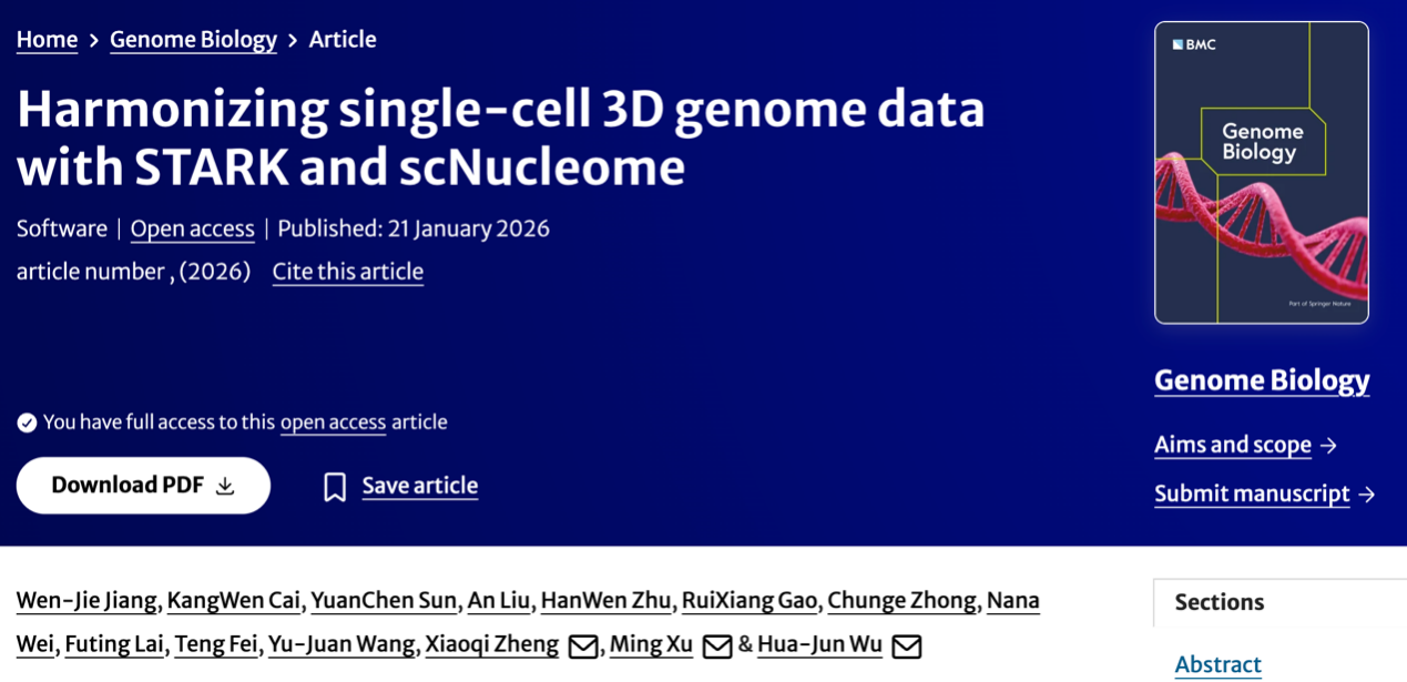 针对上述挑战,2026年1月21日北京大学临床医学高等研究院(细胞稳态与衰老性重大疾病北京研究中心)/北京大学肿瘤医院吴华君团队、北京大学第三医院徐明团队和上海交通大学公共卫生学院单细胞组学与疾病研究中心郑小琪团队在 Genome Biology 上发表了题为 “Harmonizing single-cell 3D genome data with STARK and scNucleome” 的研究论文,提出了一个通用的单细胞三维基因组分析框架 STARK(Structural Topology Analysis and Rich Knowledge),并构建了统一标准化的单细胞三维基因组数据库 scNucleome。