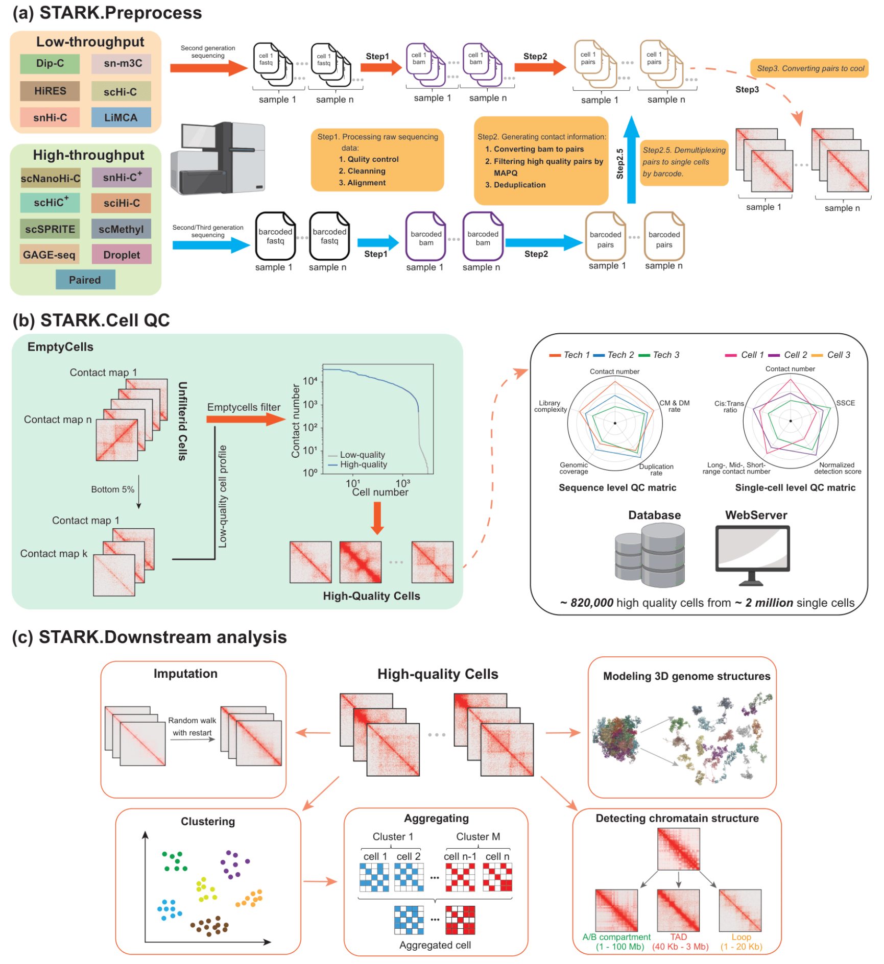文中提出的 STARK 是一个覆盖从原始数据处理到下游结构解析的完整分析平台,能够兼容几乎所有主流 sc3DG-seq 技术。STARK 包括三大核心模块:数据预处理、单细胞质量控制以及下游结构分析。在质量控制方面,作者提出了一种新的算法 EmptyCells,用于精准识别并剔除空细胞和低质量细胞;同时引入新的评价指标 SSCE(Spatial Structure Capture Efficiency),从“空间结构信息捕获效率”的角度定量评估单细胞数据质量,而不仅依赖接触对数量等传统指标。